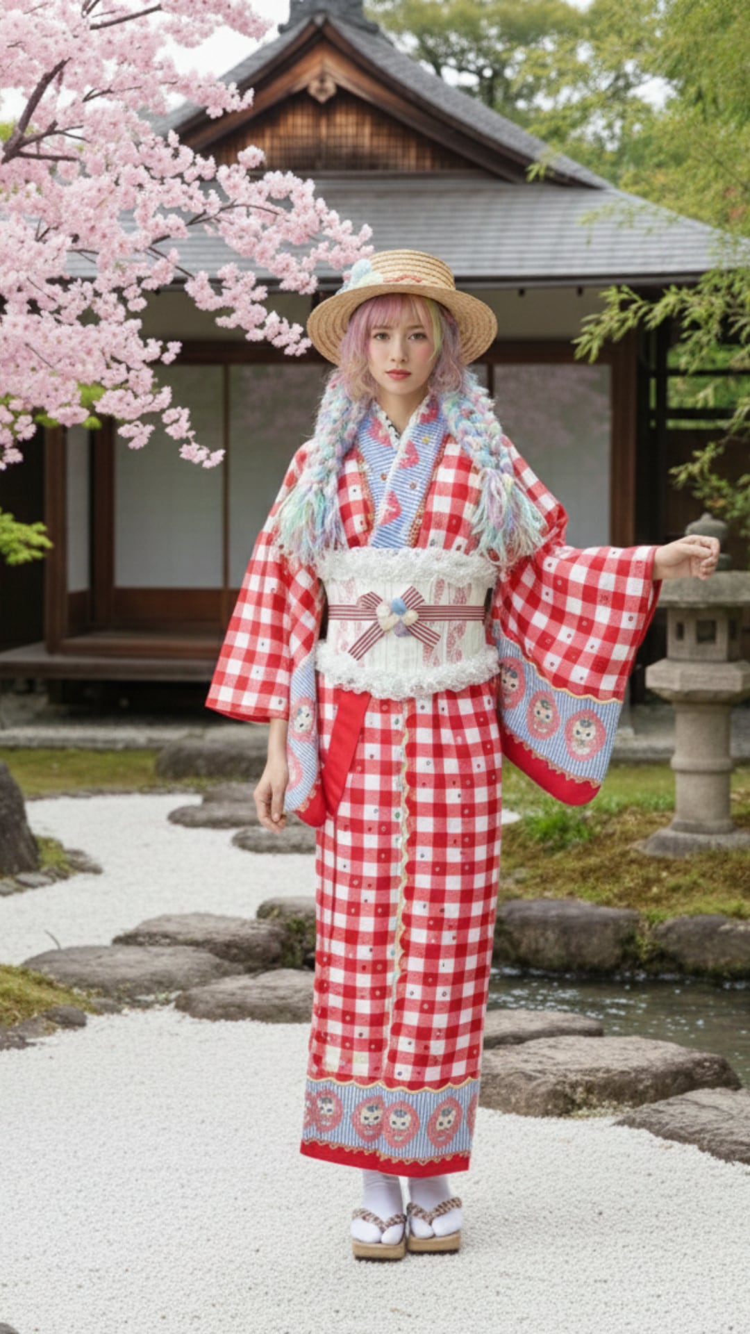 ギンガムチェックとストライプ・大柄の猫のバランスが可愛い着物です。