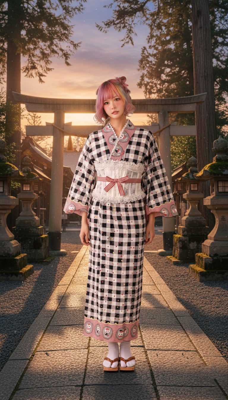 ギンガムチェックとストライプ・大柄の猫のバランスが可愛い着物です。